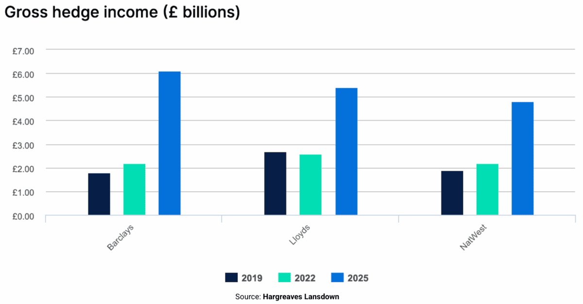 Nachfolgend finden Sie eine zweijährige Prognose von Hargreaves Lansdown. Ich habe es in der Vergangenheit mehrmals verwendet und es hat sich als sehr relevant erwiesen. Im dritten Quartal 2025 trug die Absicherungsstrategie 1,4 Mrd. £ bei.