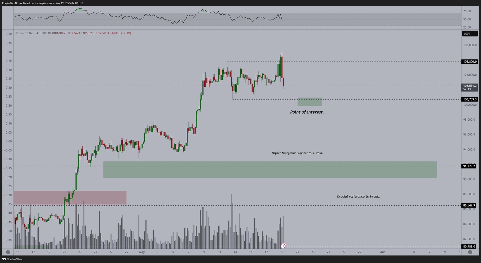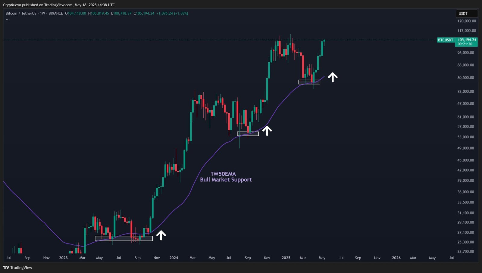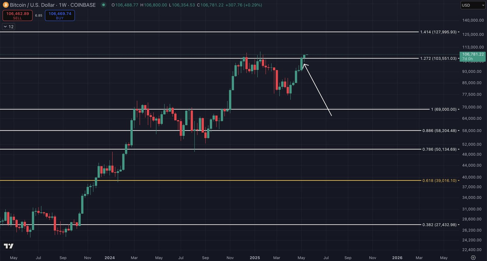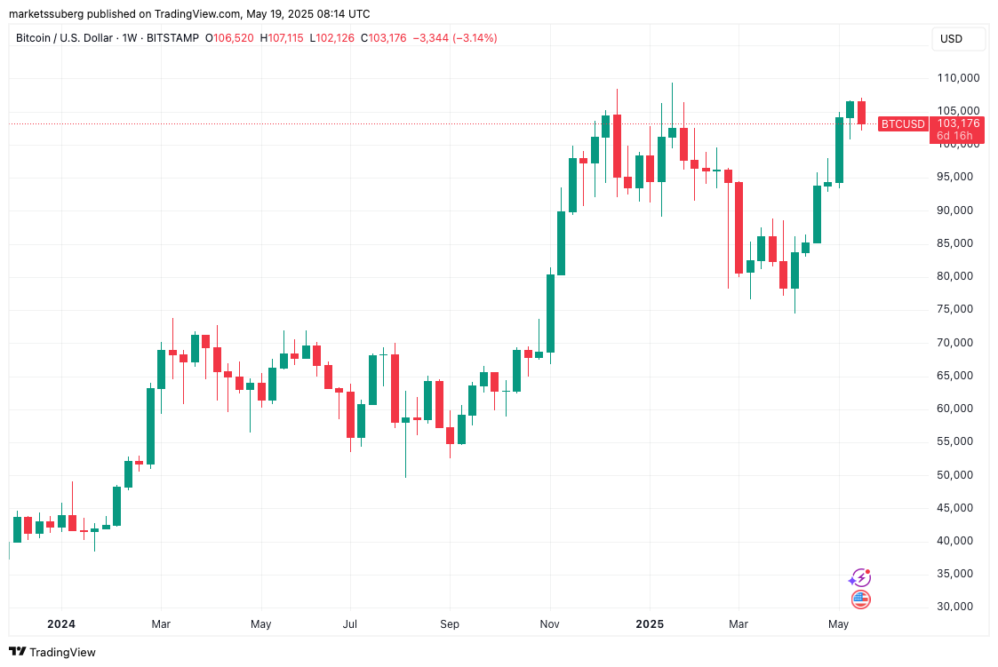 Die wöchentliche Kerze ließ sich auch bei rund 106.500 US-Dollar ein, um täglich einen neuen Allzeithochschluss zu erzielen.