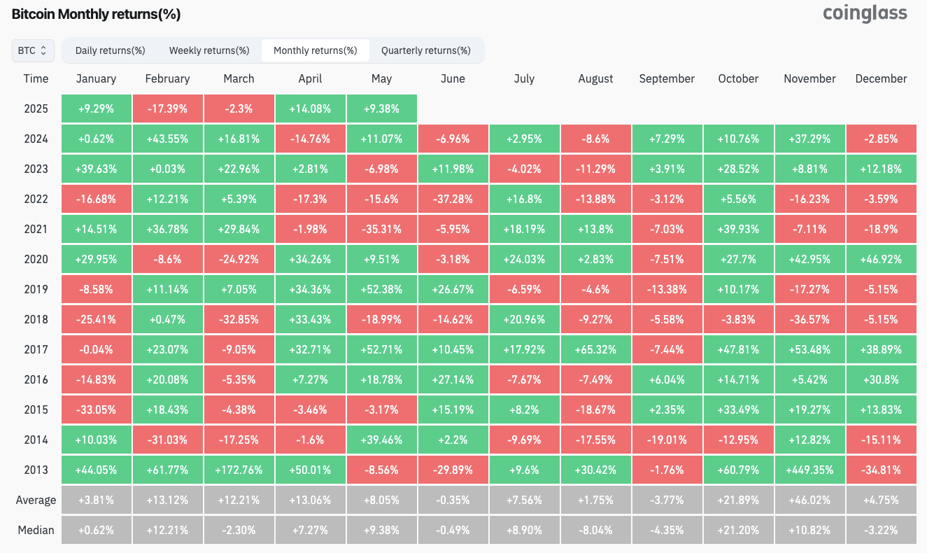 Coinglass zeigte, dass der Mai für BTC -Preisaktion ein sehr unterschiedlicher Monat ist. Derzeit liegen die 10% -Gewinne in der Mitte einer Vielzahl historischer Ergebnisse, wobei weniger als zwei Wochen bis zum monatlichen Abschluss übrig sind.