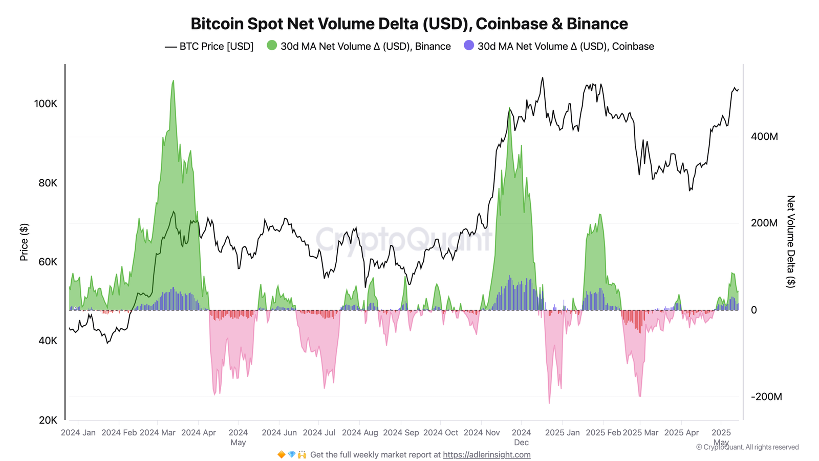 „Diese Signale, dass der Kauf von Aktivitäten auf den Spotmärkten abgeholt wird, aber was noch wichtiger ist, dass der Verkaufsdruck auch mit dem Handel von BTC über 100 000 US -Dollar erheblich zurückgegangen ist. In der Vergangenheit stieg er jedoch in der Vergangenheit zu schnell und zu stark an, dass Spot -Binance zu schnell und zu stark ansteigt, oft mit lokalen Markttops zusammen.“