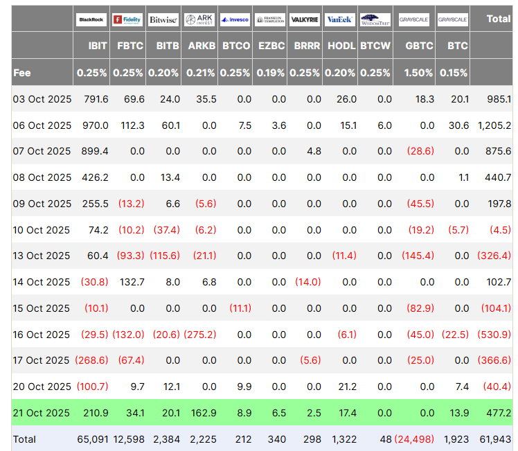 Bitcoin-ETFs verzeichneten diese Woche danach einen deutlichen Anstieg der Zuflüsse mehrere Tage politisch motivierter Abflüsse. Laut Farside Investors verzeichneten die Fonds am Dienstag positive Nettozuflüsse in Höhe von 477 Millionen US-Dollar und durchbrachen damit eine viertägige Verluststrähne.