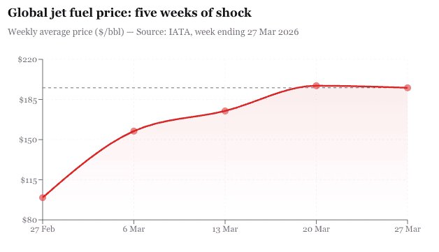 Und der IATA-Crack-Spread – die Raffinierungsmarge zwischen Rohöl und Kerosin – ist auf 81,44 US-Dollar pro Barrel gestiegen, ein Anstieg von 287 % im Vergleich zum Vorjahr, was auf einen strukturellen Druck hindeutet, der über das reine Rohöl hinausgeht.