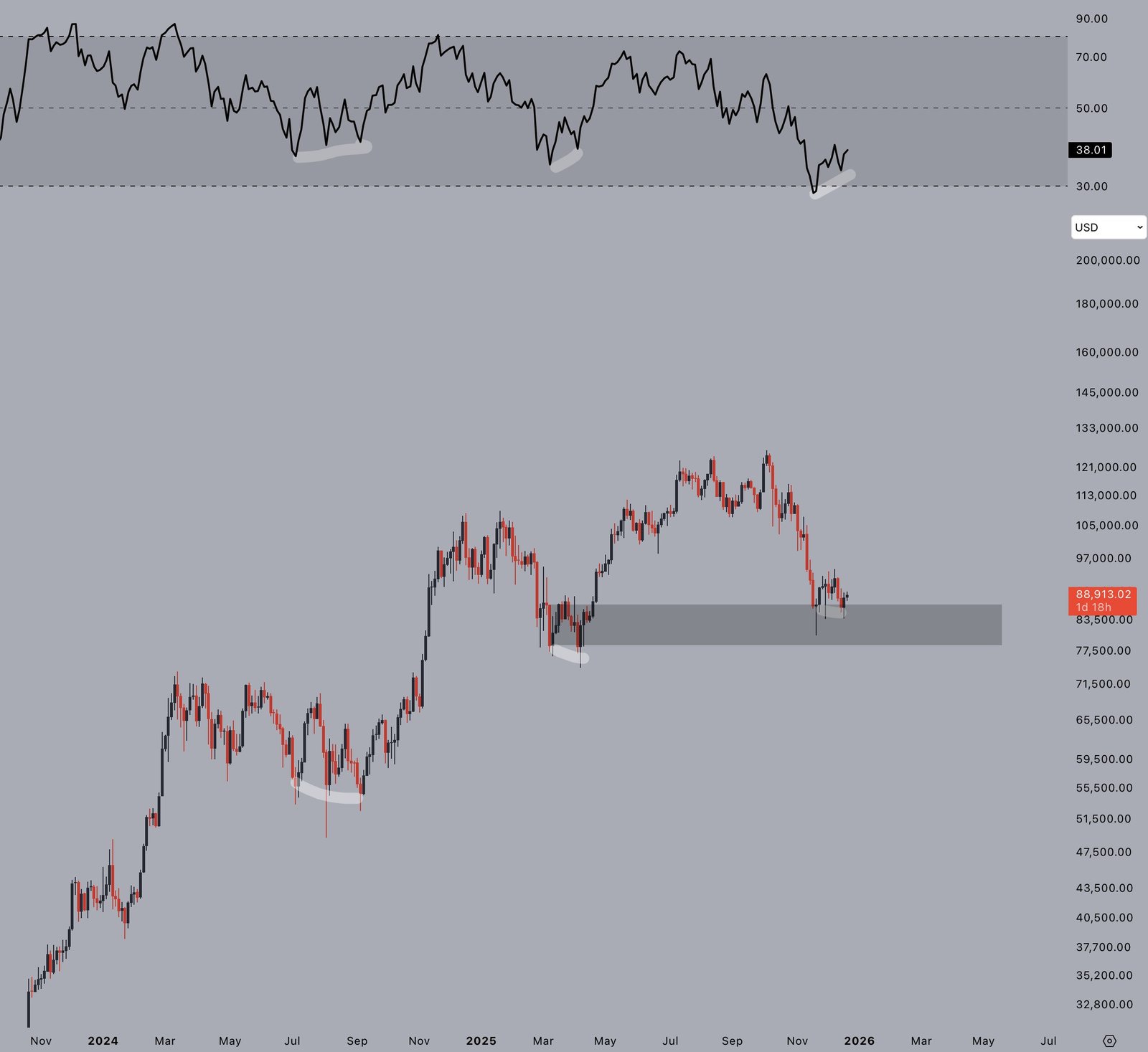 Ähnliche zinsbullische Crosses traten Anfang 2019 auf (nachdem BTC seinen Tiefststand nahe 3.200 $ erreicht hatte), im März 2020 (der COVID-Absturz Tief bei 3.800 $) und Ende 2022 (ungefähr das Zyklustief von 15.500 $). In jedem Fall änderte sich zuerst die Dynamik, während der Preis zurückblieb.