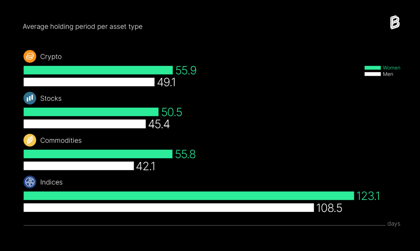 Durchschnittliche Haltedauer von Frauen und Männern pro Vermögensart Quelle: Bitpanda