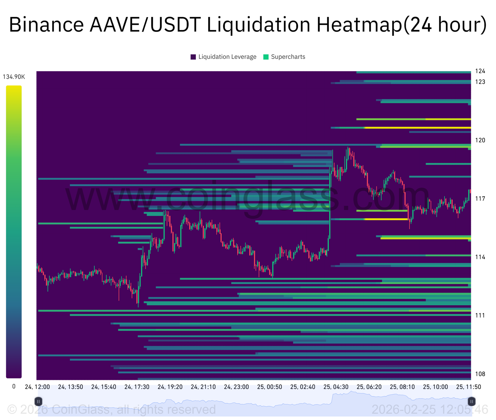 Der Liquidations-Heatmap zeigt nun einen konzentrierten Leverage-Cluster um 120,69 $, wobei der Liquidations-Leverage seinen Höhepunkt bei etwa 134,91.000 erreicht. Dieses dichte Band liegt knapp über dem aktuellen Preis und stimmt eng mit dem kurzfristigen Widerstand überein.