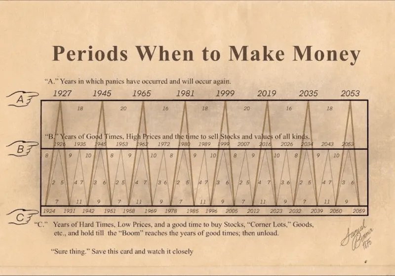 Samuel Benner’s famous 19th-century forecasting chart (first published in 1875), maps long-term cycles of panics (“A” years), booms/high prices (“B” years), and depressions/low prices (“C” years). Interestingly, 2026 falls squarely in one of Benner’s “B” years, which is a period of “Good Times, High Prices and the time to sell Stocks and values of all kinds.” The chart places 2026 right alongside previous boom years like 2016, 2007, 1999, and 1989, suggesting we are entering a structurally favorable window for risk assets.