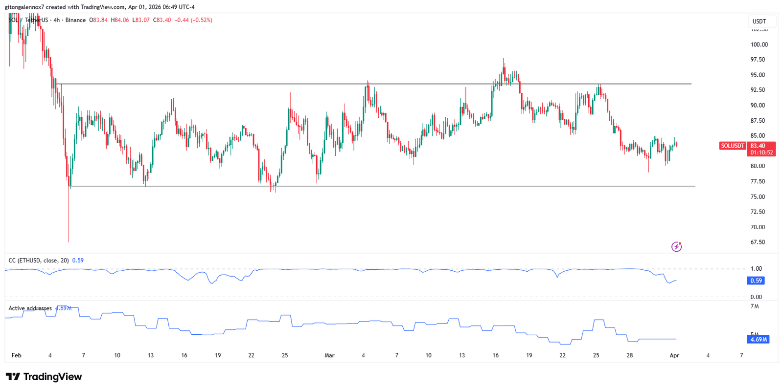 Der Altcoin könnte auf das Unterstützungsniveau von 76 US-Dollar fallen, nachdem er in der Nähe der Tiefststände dieser Spanne gehandelt wurde. Dies ist auch auf einen Rückgang der Netzwerkaktivität zurückzuführen; In nur zwei Monaten sank die Zahl der aktiven Adressen von 7 Millionen auf 4,69 Millionen.