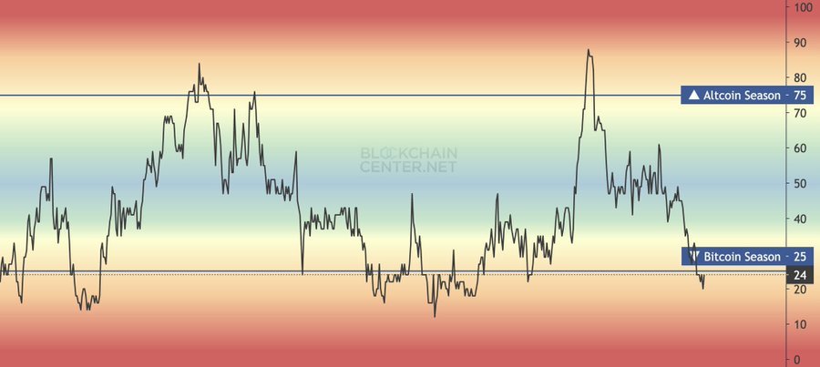 Der Altcoin -Saison -Index ist tief in das Gebiet „Bitcoin Season“ eingebrochen, während der Prozentsatz der übertreibenden Altcoins in der Nähe von Rekordtiefs schwebt.