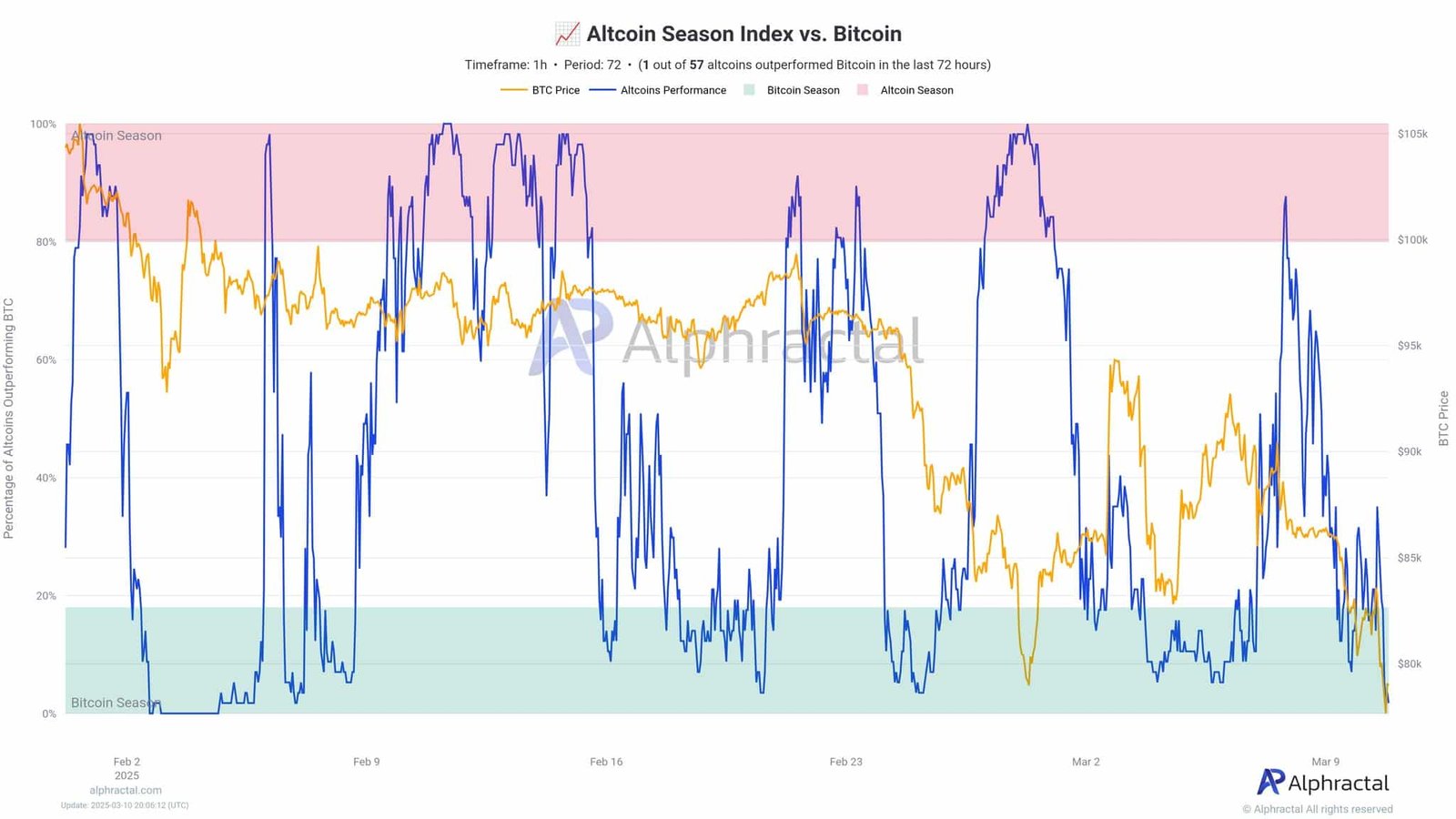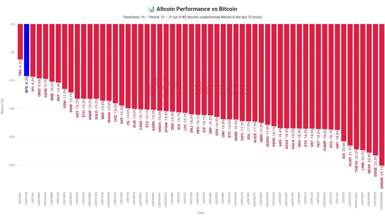 Jüngste Daten von Alphractal zeigt, dass nur 1 von 57 verfolgt wurde Altcoins hat Bitcoin in den letzten 72 Stunden übertroffen und das Ausmaß des aktuellen Abschwungs hervorgehoben.