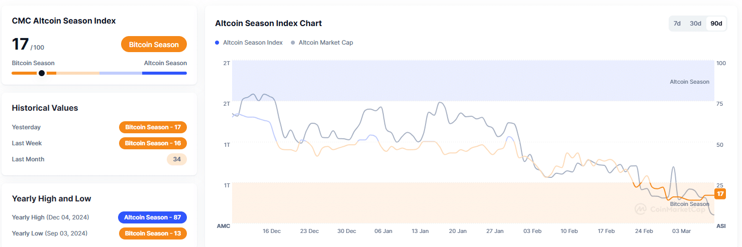 Der Altcoin Season -Index von Coinmarketcap hat sich zum Zeitpunkt der Presse auf 17 gefallen und signalisiert das Tief der Bitcoin -Saison.