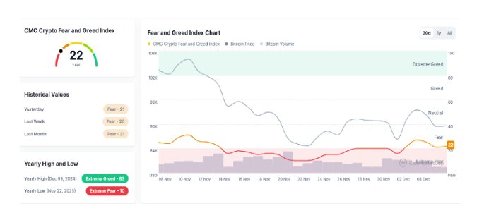 Die Stimmung zeigt sich auch im Fear and Greed Index von CoinMarketCap, der jetzt bei 22 liegt. Dieser niedrige Wert signalisiert Zögern im gesamten Markt, da Anleger davor zurückschrecken, neue Positionen einzugehen, und dieses Umfeld macht es viel schwieriger, eine Altcoin-Saison zu verwirklichen.