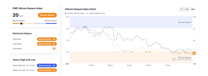 Auch die allgemeine Stimmung hat sich abgeschwächt: Der CMC Altcoin Season Index liegt bei nur 20, womit immer noch der gesamte Markt im Mittelpunkt steht in einer von Bitcoin begünstigten Phase. Mittlerweile wurde in den On-Chain-Daten ein kritischer Hinweis entdeckt, der darauf hindeutet, dass dies möglicherweise ein seltener Moment ist, um starke Altcoin-Positionen aufzubauen, bevor sich die Lage schließlich ändert.
