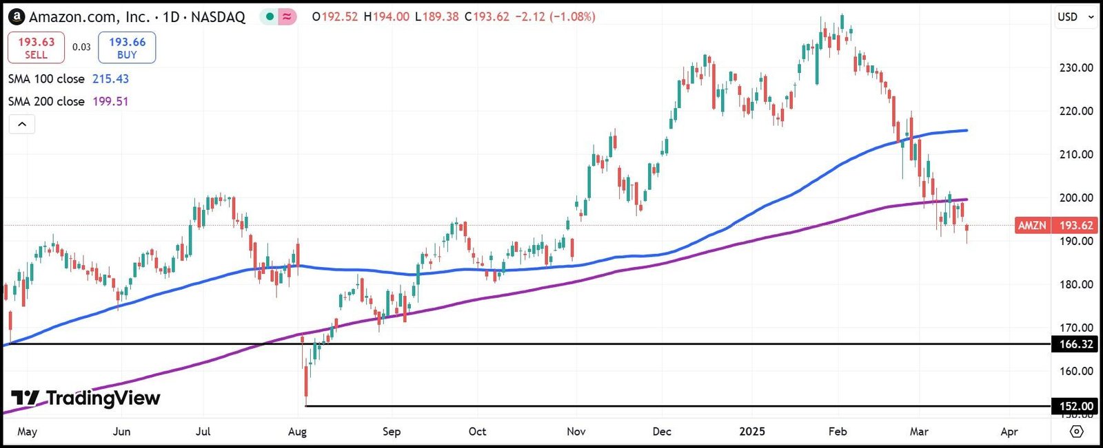 Erwarten Sie, dass Amazon eine Stabilisierung findet, sobald sie den letzten Jahr am 25. April in der Nähe von 166 US -Dollar oder den Flash -Crash am 5. August in der Nähe von 152 US -Dollar erreicht hat.
