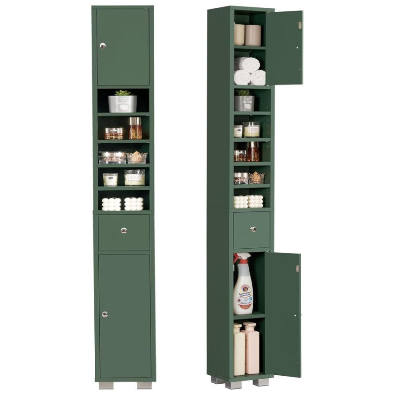 Dieser Aufbewahrungsschrank verfügt über fünf verstellbare Einlegeböden, sodass Sie Platz für größere oder kleinere Gegenstände schaffen. Es verfügt außerdem über vier weitere Regale im Ober- und Unterschrank. Die Schublade in der Mitte ist ideal für Gegenstände wie Kosmetika, Pflaster und andere kleinere Gegenstände, die herumrollen oder leicht aus den Regalen fallen könnten. Die gesamte Einheit ist 20 cm tief, 20 cm breit und 71 Zoll hoch und bietet Platz für Gegenstände wie hohe Papierhandtücher, Shampooflaschen, Lotionsflaschen, Reinigungsspray, aufgerollte Handtücher und mehr. Es ist perfekt für all die kleinen Kleinigkeiten, die auf der Arbeitsplatte liegen bleiben oder in größeren Badezimmerschränken verloren gehen.