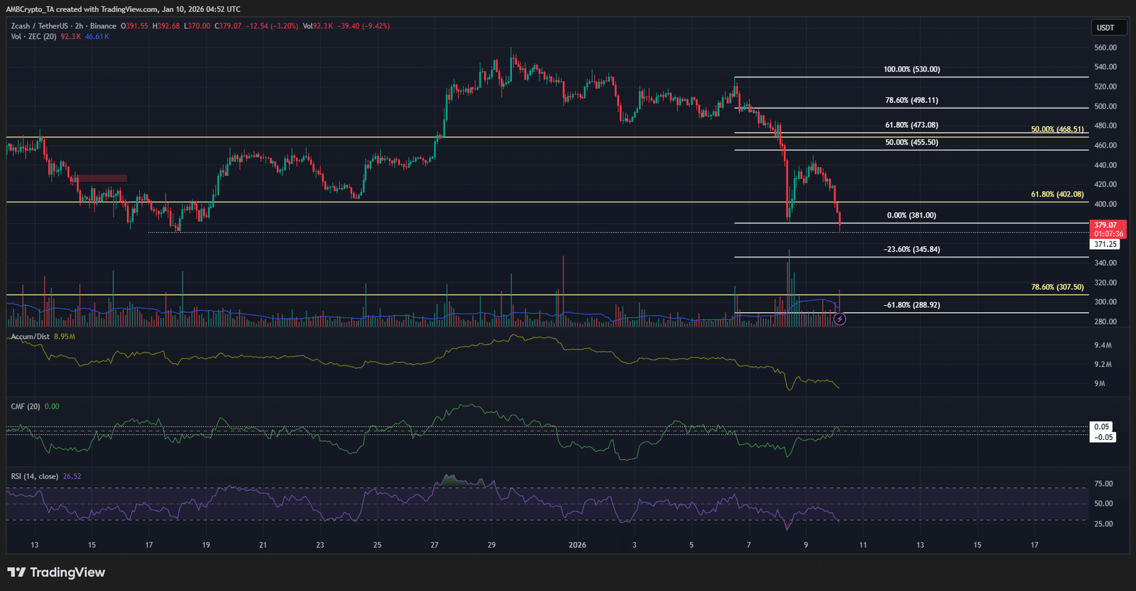 Zum Zeitpunkt des Verfassens dieses Artikels wurde das lokale Tief von 381 US-Dollar in Frage gestellt und dürfte überwunden werden. Die 371-Dollar-Marke, die im letzten Monat bereits als prominente Unterstützung hervorgehoben wurde, wird ein entscheidendes Niveau sein. Ein Rückgang unter dieses Niveau würde bedeuten, dass Händler versuchen sollten, ZEC zu verkaufen und als nächstes 345 US-Dollar und 307 bis 288 US-Dollar anzustreben.