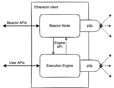 Als Erinnerung besteht nach Merge ein vollständiger Ethereum-Kunde sowohl aus einem Beacon- / Konsensknoten als auch aus einer Ausführungsmaschine (von einem bestehenden “ETH1” -Kunden). Beide Schichten halten unabhängige API -Endpunkte und Peer -Verbindungen bei, um ihre jeweilige Rolle zu übernehmen. Eine vollständige Übersicht über die Post-Merge-Architektur von Ethereum finden Sie unter Dieser Beitrag.