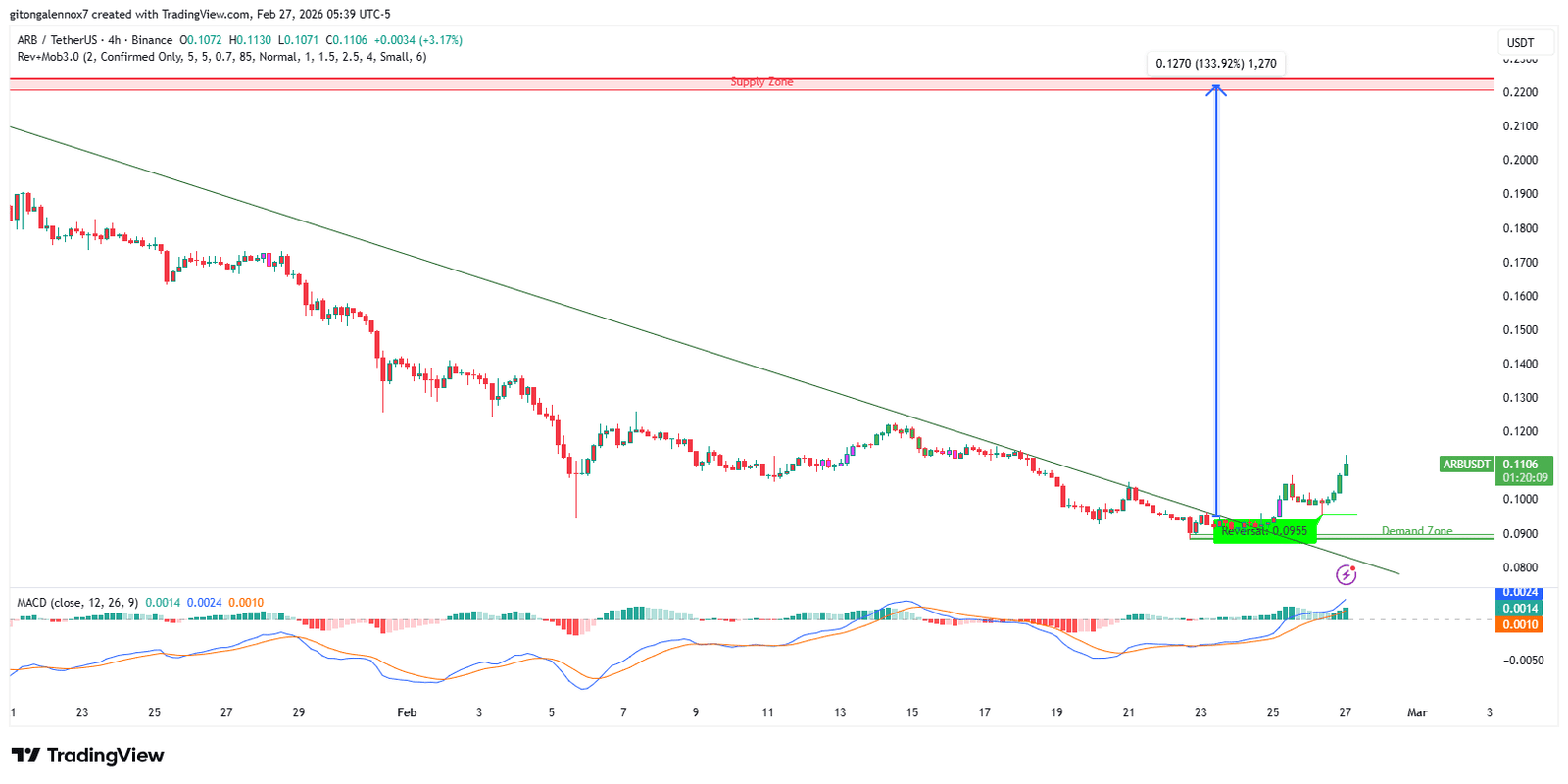 Auf den Charts, ARBs Der Preis erholte sich von der Nachfragezone bei 0,0955 $, wie aus dem Umkehrerkennungsindikator hervorgeht. Die Umkehr erfolgte, als der Preis in der Nähe des seit dem 14. Februar bestehenden schrägen Widerstands handelte.