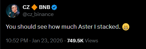 In diesem Zusammenhang Aster [ASTER] ist kürzlich ins Rampenlicht gerückt. Binance-Gründer CZ postete auf X und löste einen weiteren Marktrausch aus, auch wenn er nicht verriet, wie viel ASTER er tatsächlich eingesetzt hatte.