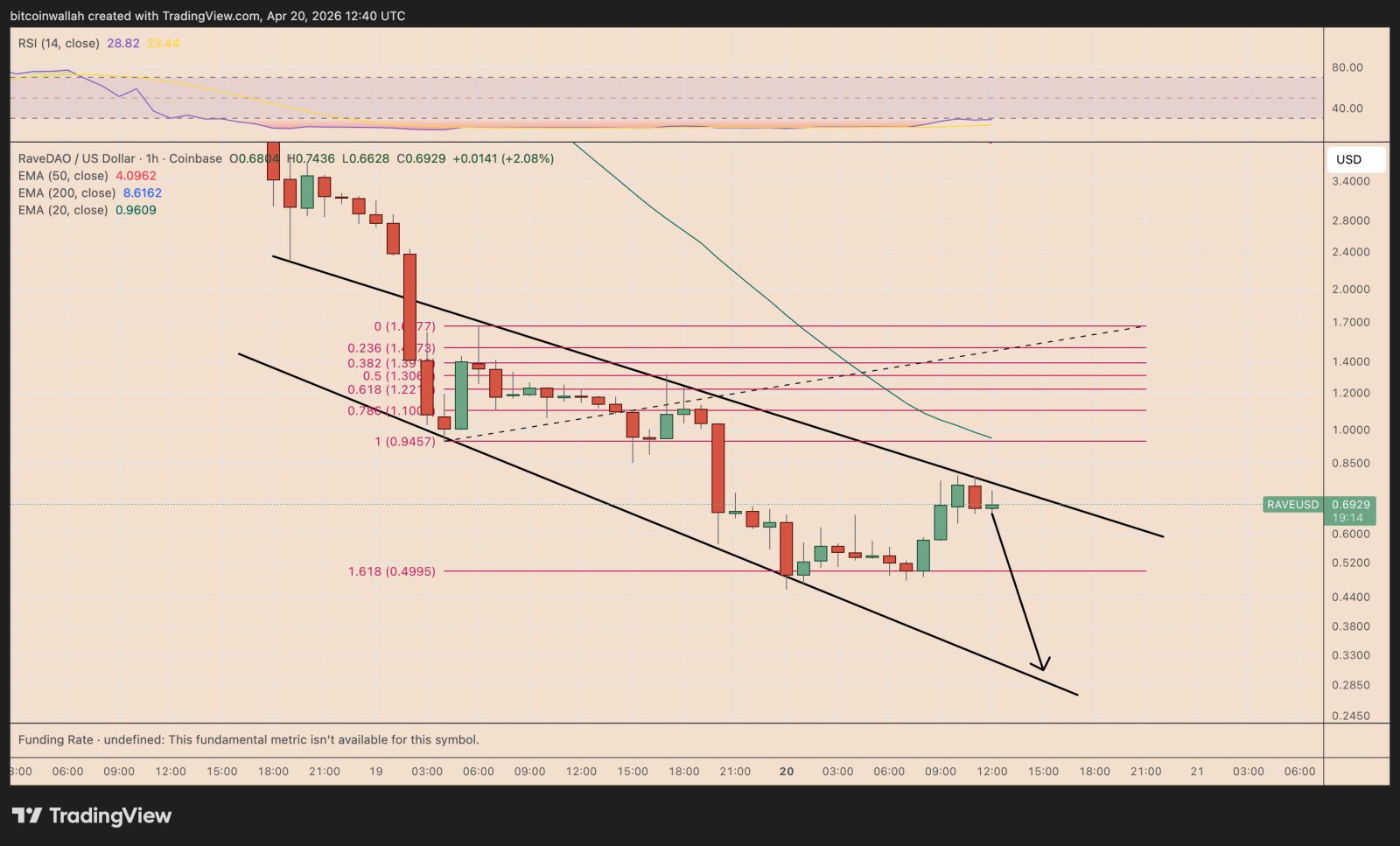 Auf dem Stunden-Chart handelt RAVE weiterhin innerhalb eines absteigenden Kanals, wobei sich niedrigere Hochs und niedrigere Tiefs zwischen zwei absteigenden Trendlinien bilden.