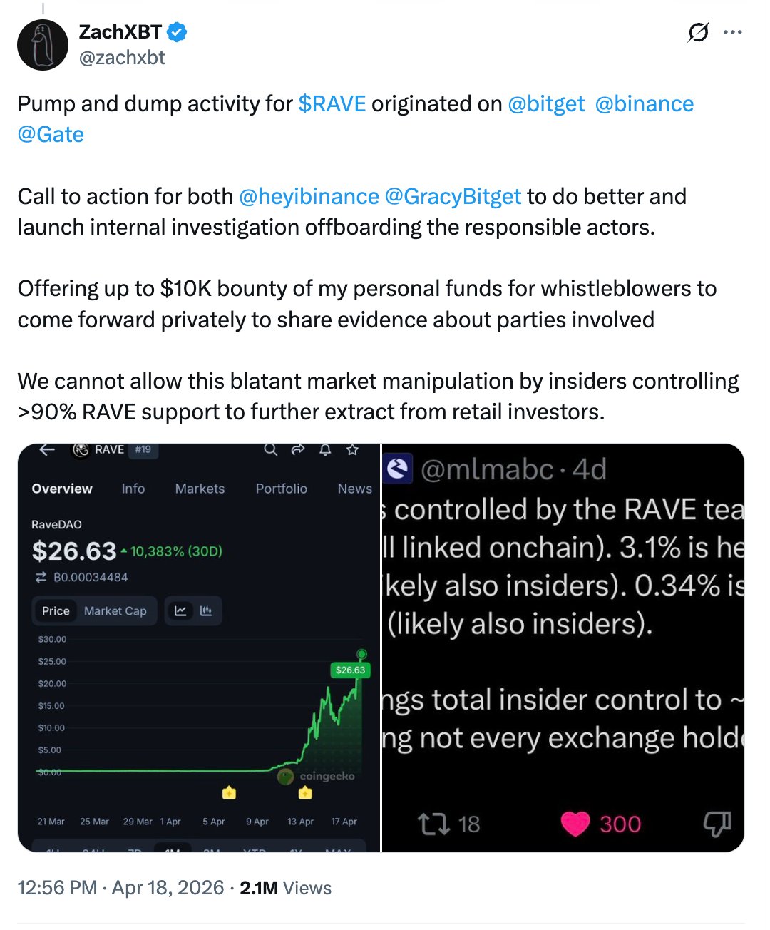 Er meldete, dass etwa 23 Millionen RAVE-Token (im Wert von rund 23 Millionen US-Dollar) kurz vor einem 40-prozentigen Flash-Crash von einer mit dem Team verknüpften Multisig-Wallet an Bitget-Einzahlungsadressen verschoben wurden, und hat seitdem ein Kopfgeld von 25.000 US-Dollar für Whistleblower ausgesetzt.