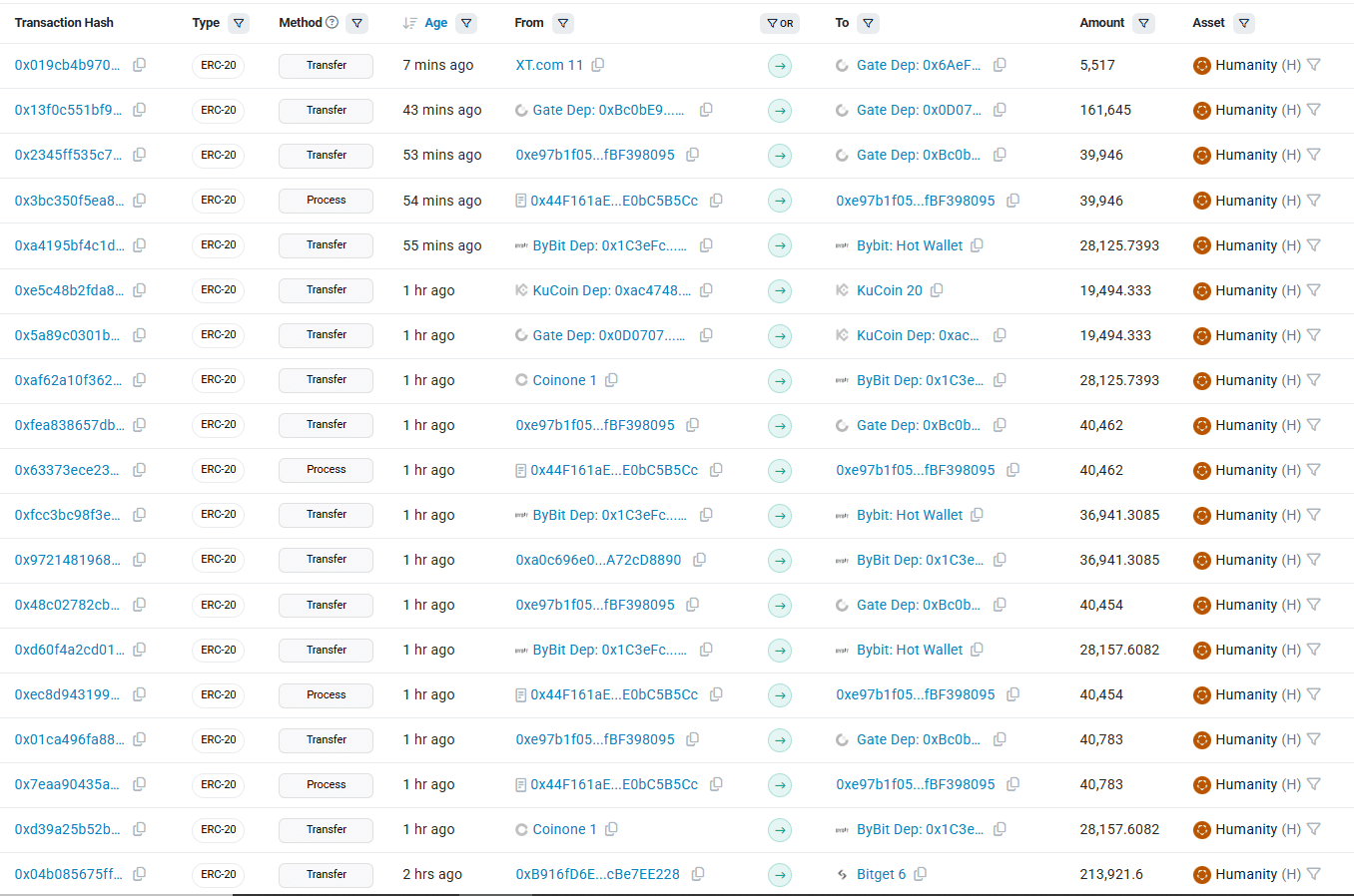 Laut Etherscan haben Inhaber ihre Token an verschiedene Börsen wie Bybit, KuCoin und Gate.io übertragen. Die größte und letzte Überweisung betrug 161.645 H, eingezahlt an die Adresse von Gate.io.