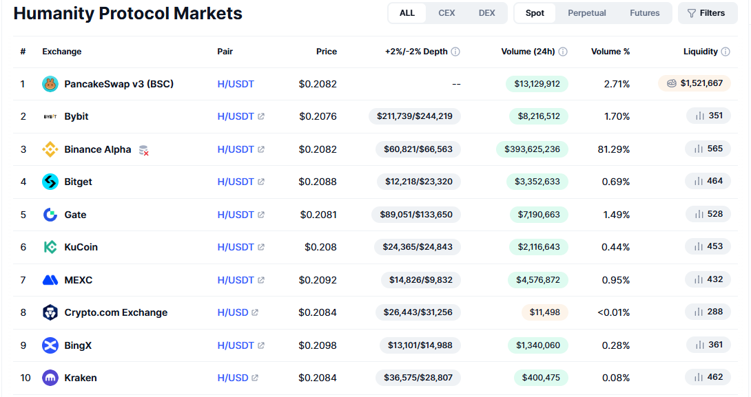 Die Rallye von Humanity Protocol (H) wurde durch das Spotvolumen vorangetrieben, das bei Redaktionsschluss um mehr als 148 % anstieg. Etwa 81 % dieses Volumens stammten vom Binance Alpha-Markt, der mit 565 auch den höchsten Liquiditätswert aufwies.