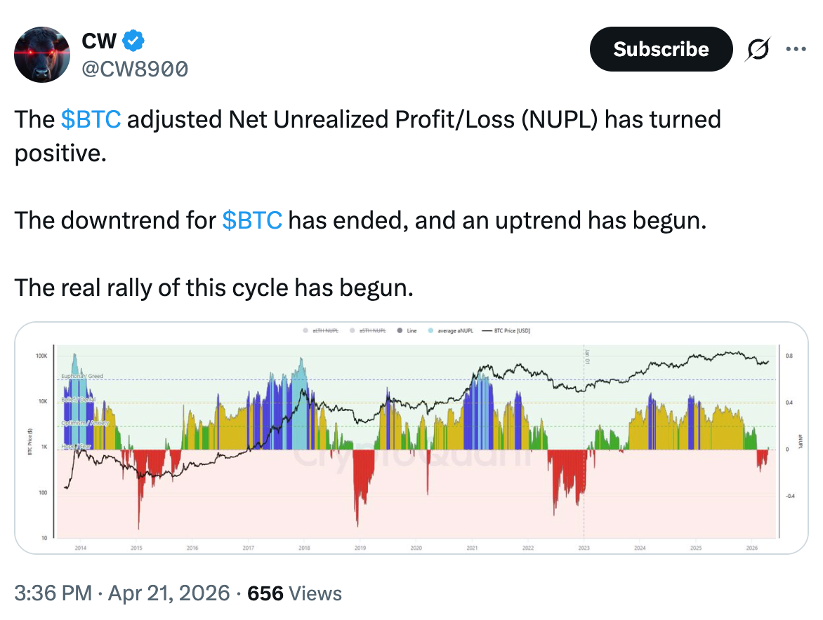Dies deutet darauf hin, dass der Abwärtstrend für Bitcoin beendet ist und die „echte Rallye dieses Zyklus begonnen hat“, CW8900 sagte in einem anderen X-Beitrag.