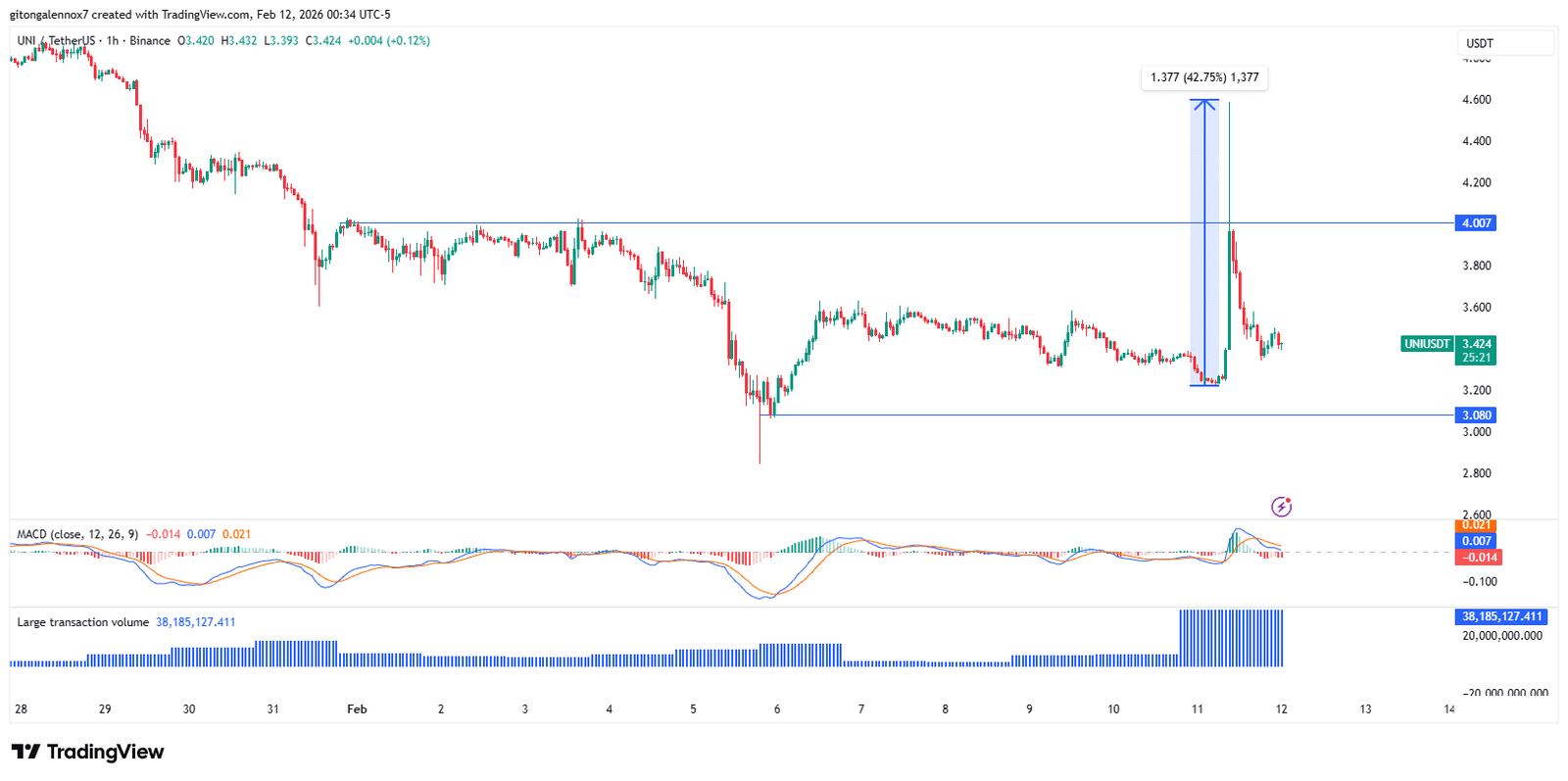 Der Preis von UNI stieg nach der Nachricht von der BUIDL-Integration um mehr als 42 %. UNI stieg in nur zwei Stunden von etwa 3,225 $ auf 4,588 $, wobei die Hauptbewegung unmittelbar nach der offiziellen Veröffentlichung stattfand.