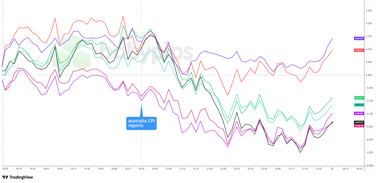 Der australische Dollar, der zu Beginn des Tages leicht optimistisch war, stieg nach dem klebrigen Inflationsdruck kurzzeitig an. Allerdings fiel der AUD etwa 15 Minuten später nach unten und blieb dann nach der Veröffentlichung etwa anderthalb Stunden lang auf dem Rückzug.