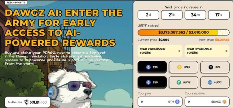 Mit über 3 Millionen US -Dollar, die während ihres Vorverkaufs gesammelt wurden, kombiniert Dawgz AI Viralität und robuste Technologie zu einer intelligenten Erzählung, die auf den Markt für 2025 zugeschnitten ist.