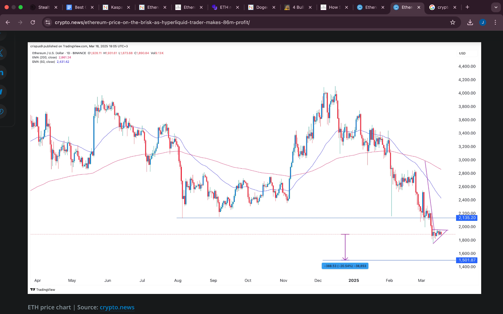 Standard gechartert Außerdem reduzierte der projizierte Preis von Ethereum im Rahmen ihrer Vorhersage von 10.000 USD auf 4.000 USD, was darauf hinweist, dass institutionelle Anleger ein langsameres Wachstumstempo für das Netzwerk erwarten. In der täglichen Preisbewegungen von Ethereum gibt es möglicherweise eine bärische Pennantstruktur, die darauf hindeutet, dass die Münze bei Validierung dieser Formation 1.500 US -Dollar erreichen könnte. Die Situation schafft Unsicherheit, da Händler fortgesetzte Ausbruchbewegungen beobachten müssen, um Trends zu bestätigen, bevor sie wichtige Handelspositionen festlegen.