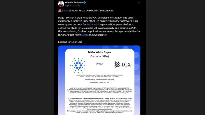 Ein Beitrag, in dem Cardanos Mica -Konformität in der EU durch die Einreichung eines konformen Whitepapers angekündigt wurde. Quelle Giannis Andreou über x