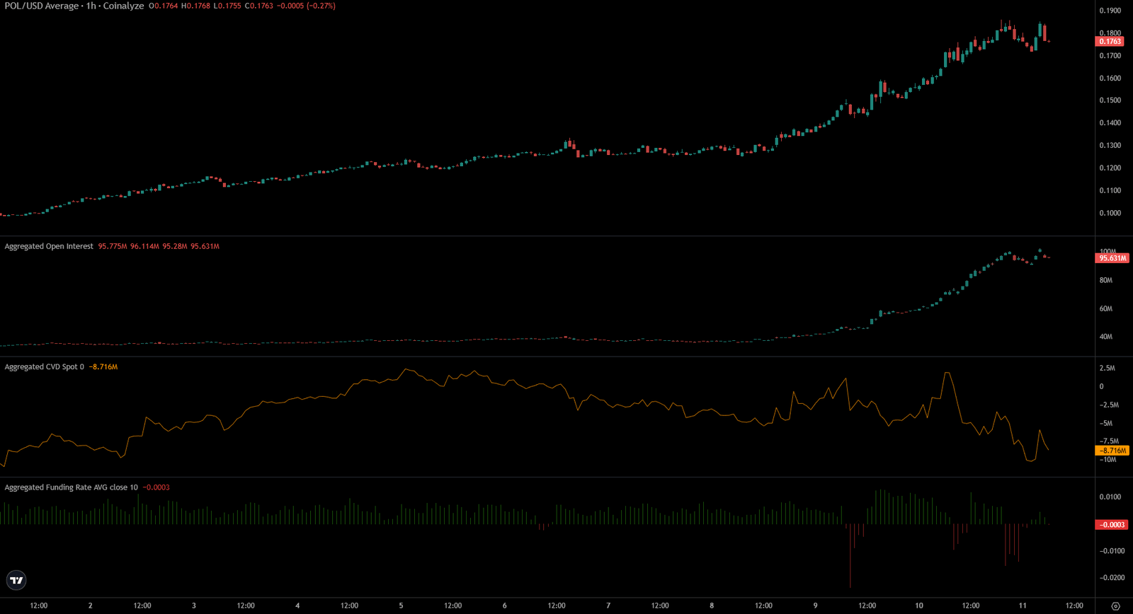 Coinalyze-Daten zeigten, dass in den letzten Tagen ein starker Rückgang des POL-Spot-CVD zu verzeichnen war. Das Open Interest hat sich von 37 Millionen US-Dollar auf 92 Millionen US-Dollar mehr als verdoppelt, aber der Rückgang des Spot-CVD deutete auf eine Divergenz zwischen Preis und Spot-Nachfrage hin, die auf eine kurzfristige Erschöpfung hinweisen könnte.