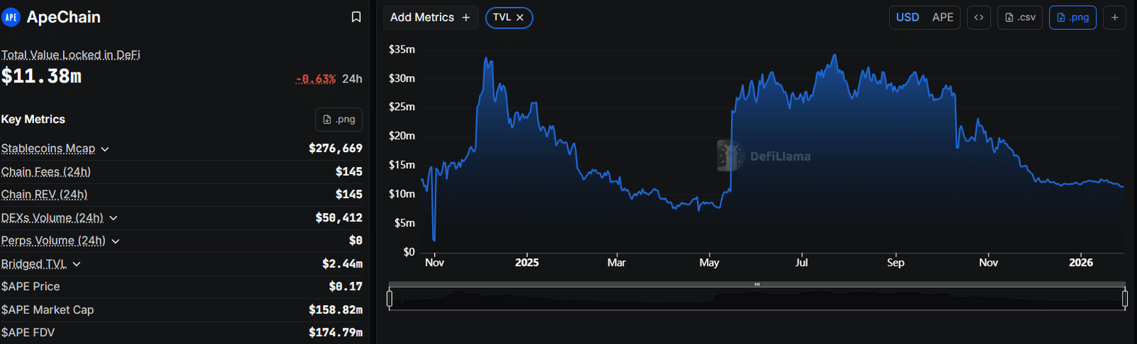 Zu diesem Zeitpunkt war die On-Chain-Aktivität bei ApeChain bereits ins Stocken geraten TVL um über 80 % von etwa 34 Millionen US-Dollar auf fast 5 Millionen US-Dollar gesunken.