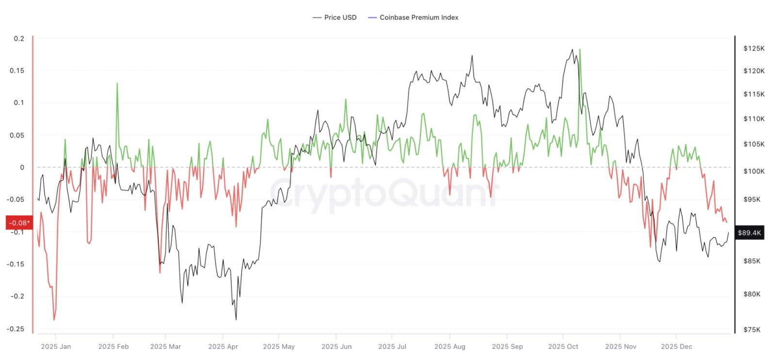 Die Coinbase-Prämie ist ein Indikator für die Nachfrage von US-Privatanlegern, und ein negativer Wert deutet auf mehr Verkaufsdruck hin.