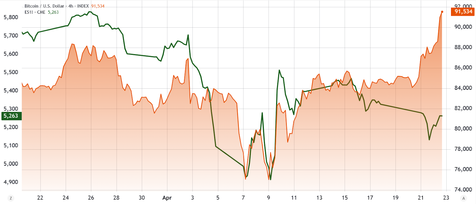 Bitcoin (BTC) stieg am 22. April auf ein 45-tägiges Höchstwert über 91.000 US-Dollar, und die Aufwärtsbewegung fiel mit Gold zusammen, das ein neues Allzeithoch erreichte. Die Preisgewinne spiegeln die Bedenken der Anleger in Bezug auf eine potenzielle wirtschaftliche Rezession inmitten der anhaltenden globalen Handelsspannungen wider.