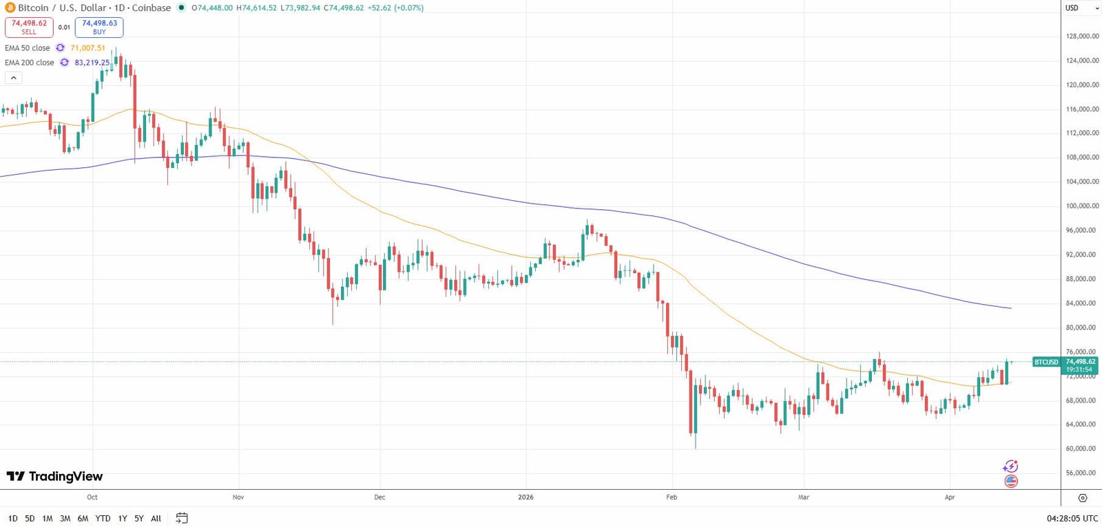 Die pessimistische Stimmung bleibt bei renommierten Analysten trotz der heutigen Prognose bestehen Bitcoin-Rallye auf knapp unter 75.000 US-Dollar aufgrund der erneuten Hoffnung auf ein Abkommen zwischen den USA und dem Iran, um den wochenlangen Konflikt zu beenden, der die globalen Märkte unterdrückt hat.