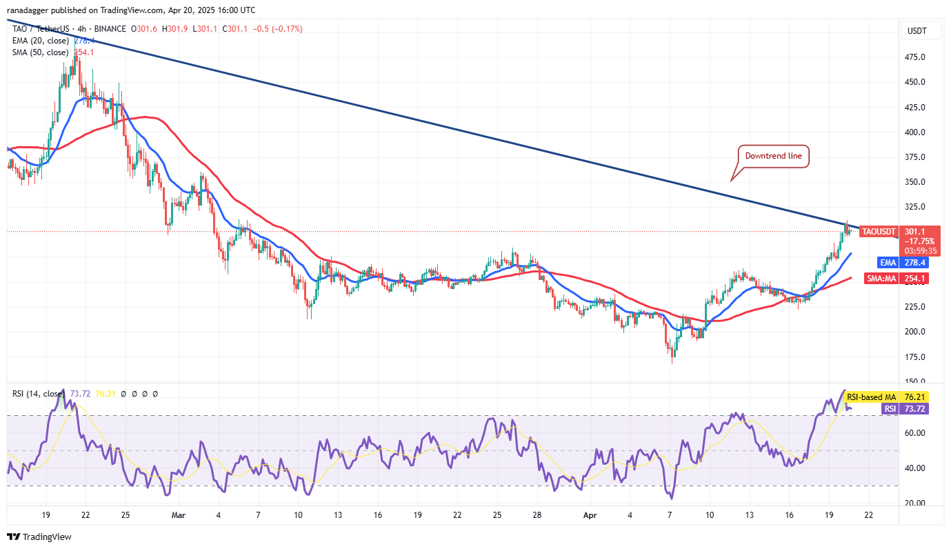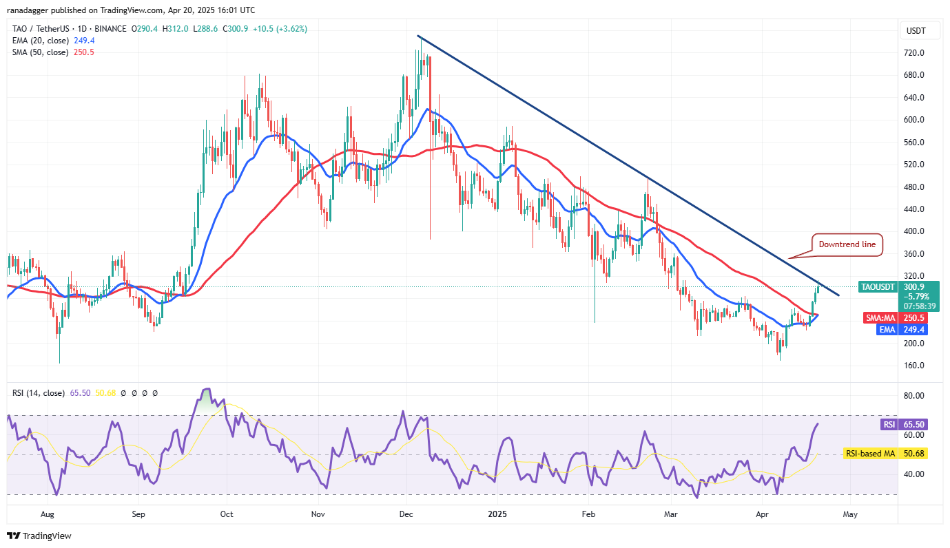 Wenn der Preis von der Abwärtstrendlinie senkt, wird das TAO/USDT-Paar wahrscheinlich Unterstützung bei der 20-Tage-EMA (249 USD) finden. Ein solider Absprung von der 20-tägigen EMA verbessert die Aussichten einer Rallye über der Abwärtstrendlinie. Das Paar könnte dann auf 360 US -Dollar steigen.