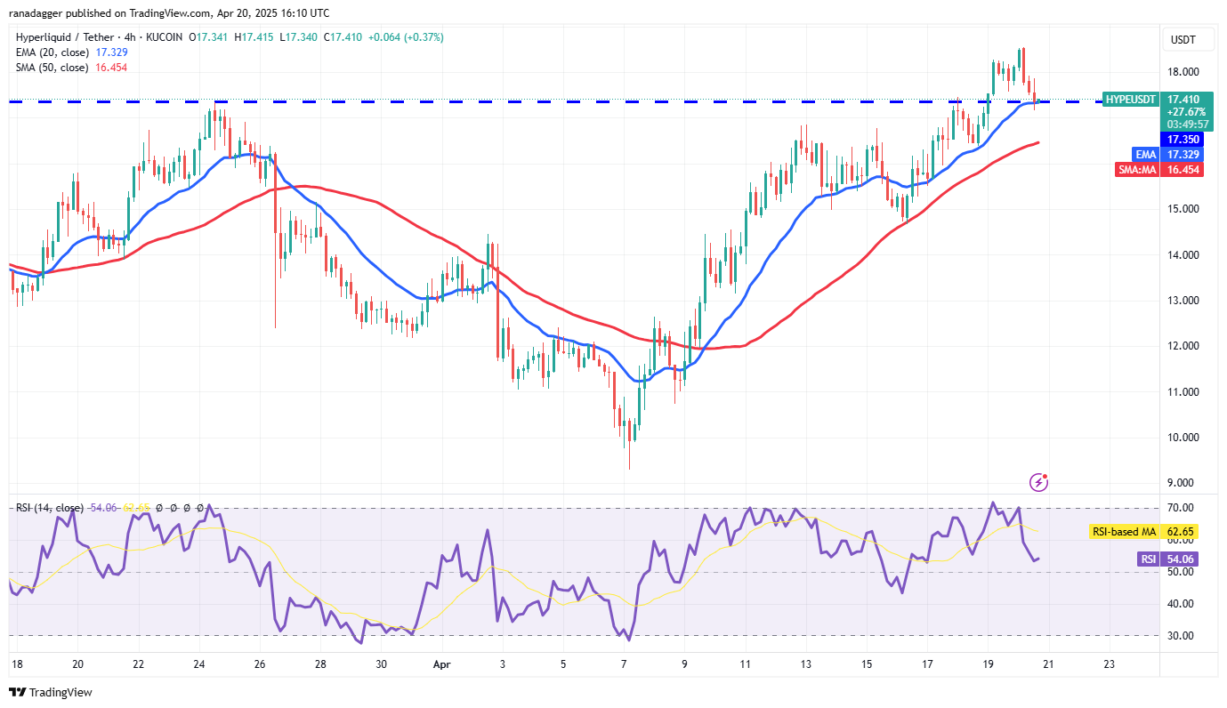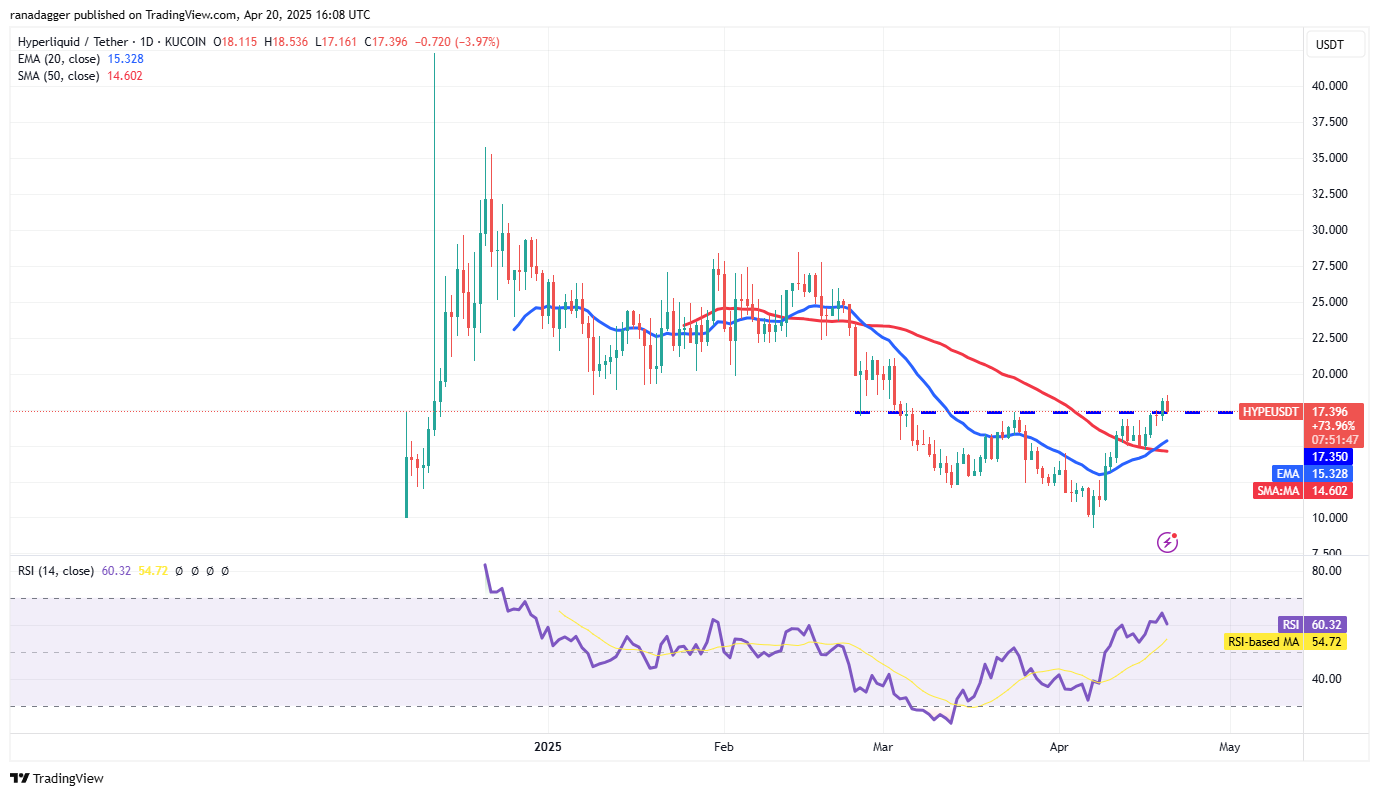 Hyperliquid (Hype) stieg und schloss am 19. April über den Overhead -Widerstand von 17,35 US -Dollar, aber die Bullen sind mit einem höheren Niveau ausgesetzt.