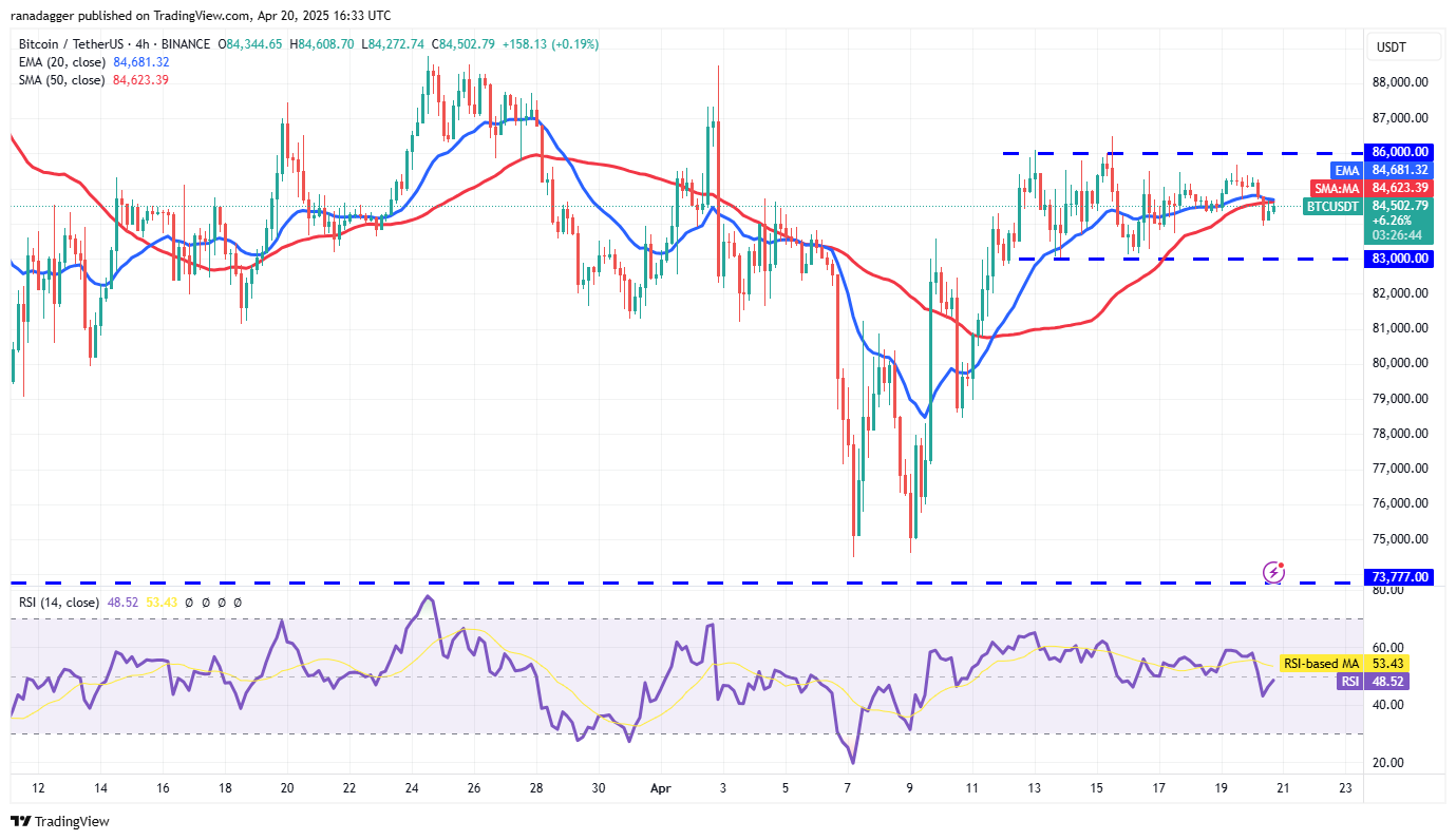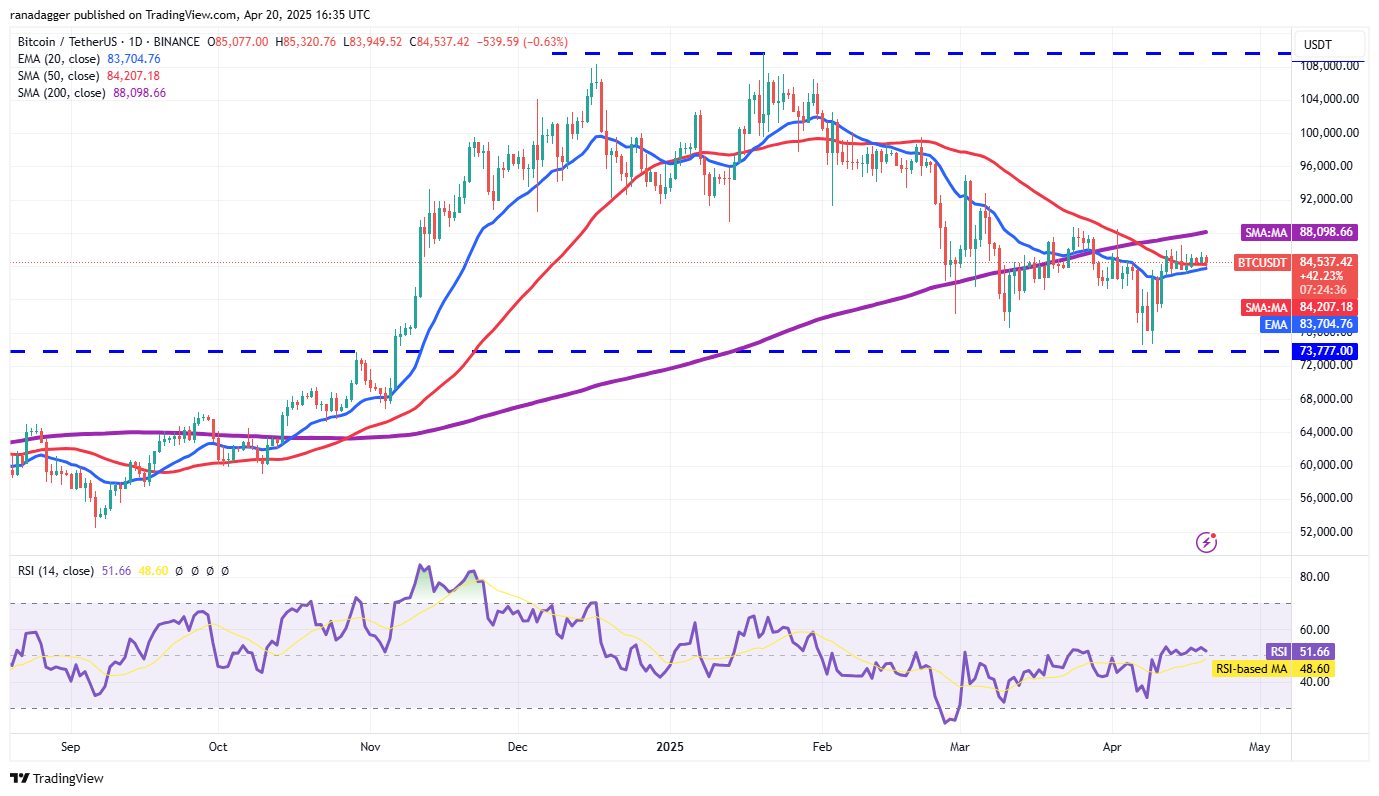Bitcoin ist in den letzten Tagen über dem 20-tägigen exponentiellen gleitenden Durchschnitt (83.704 US-Dollar) geblieben, aber die Bullen haben den 200-Tage-einfachen gleitenden Durchschnitt (88.098 US-Dollar) nicht in Frage gestellt.