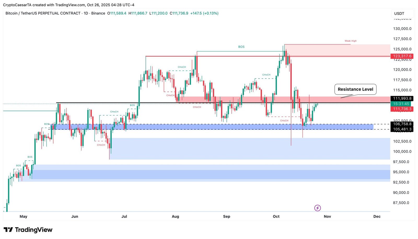 Der Händler Crypto Caesar beobachtete, wie die Widerstandsmarke von 112.000 $ an diesem Tag erneut getestet wurde.