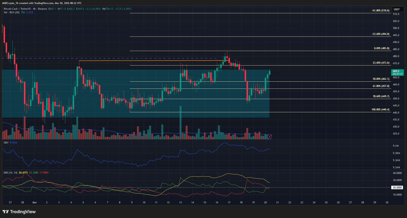 Ein anschließender Rückgang auf 449 US-Dollar stellte einen Test einer wichtigen Fibonacci-Unterstützung dar, und BCH hat sich seitdem erholt. Der OBV hat in den letzten zwei Wochen höhere Tiefststände erreicht. Der DMI hat sich gedreht und zeigt, dass in diesem Zeitraum ein starker Aufwärtstrend im Gange ist.