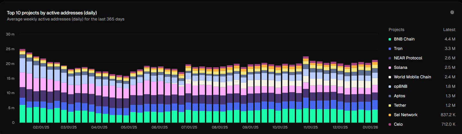 Im Gegenteil, BNB Chain erzählt uns eine stärkere Nutzungsgeschichte. Adressen geklettert über 730 Millionen. Noch wichtiger ist, dass täglich aktive Nutzer mit rund 4,4 Millionen an der Spitze standen. Da Benutzer häufig Transaktionen durchführen, bleibt das Volumen hoch, was in diesem Zyklus zu sinkenden Gebühren führt.