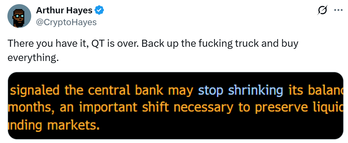 Hinzu kommt die jüngste Entscheidung der Federal Reserve, ihr quantitatives Straffungsprogramm (QT) am 1. Dezember zu stoppen. QT ist der Prozess der Verkürzung der Bilanz der Zentralbank. Das Ziel von QT besteht darin, eine überhitzte Wirtschaft abzukühlen und einen zu schnellen Anstieg der Inflation zu verhindern.