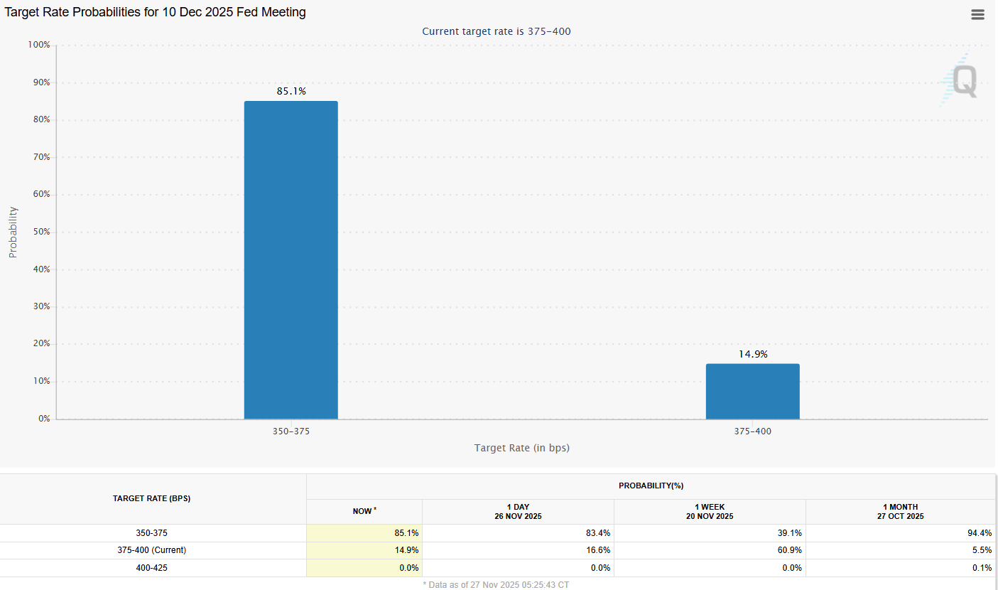 Die Erholung von Bitcoin folgt einem starken Anstieg der Zinssenkungserwartungen für die Sitzung der US-Notenbank am 10. Dezember, wobei die Wahrscheinlichkeit innerhalb einer Woche um 46 % stieg.