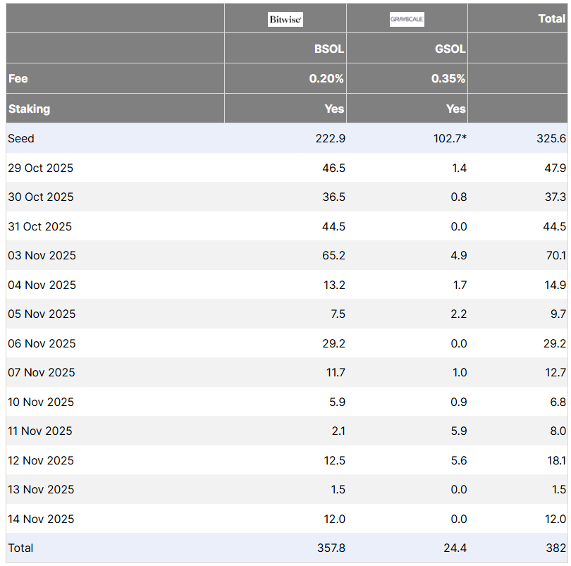 Solana ETFs endeten letzte Woche mit Zuflüssen in Höhe von 12 Millionen US-Dollar am Freitag und verzeichneten seit ihrer Einführung am 29. Oktober 13 Tage in Folge Zuflüsse.