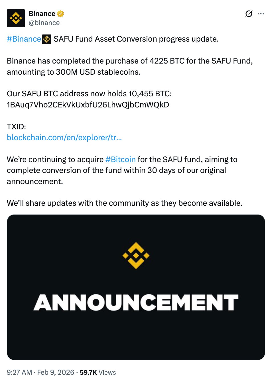 Die SAFU-BTC-Adresse enthält jetzt 10.455 BTC im Wert von 731 Millionen US-Dollar, sodass noch etwa 239 Millionen US-Dollar umgewandelt werden müssen.