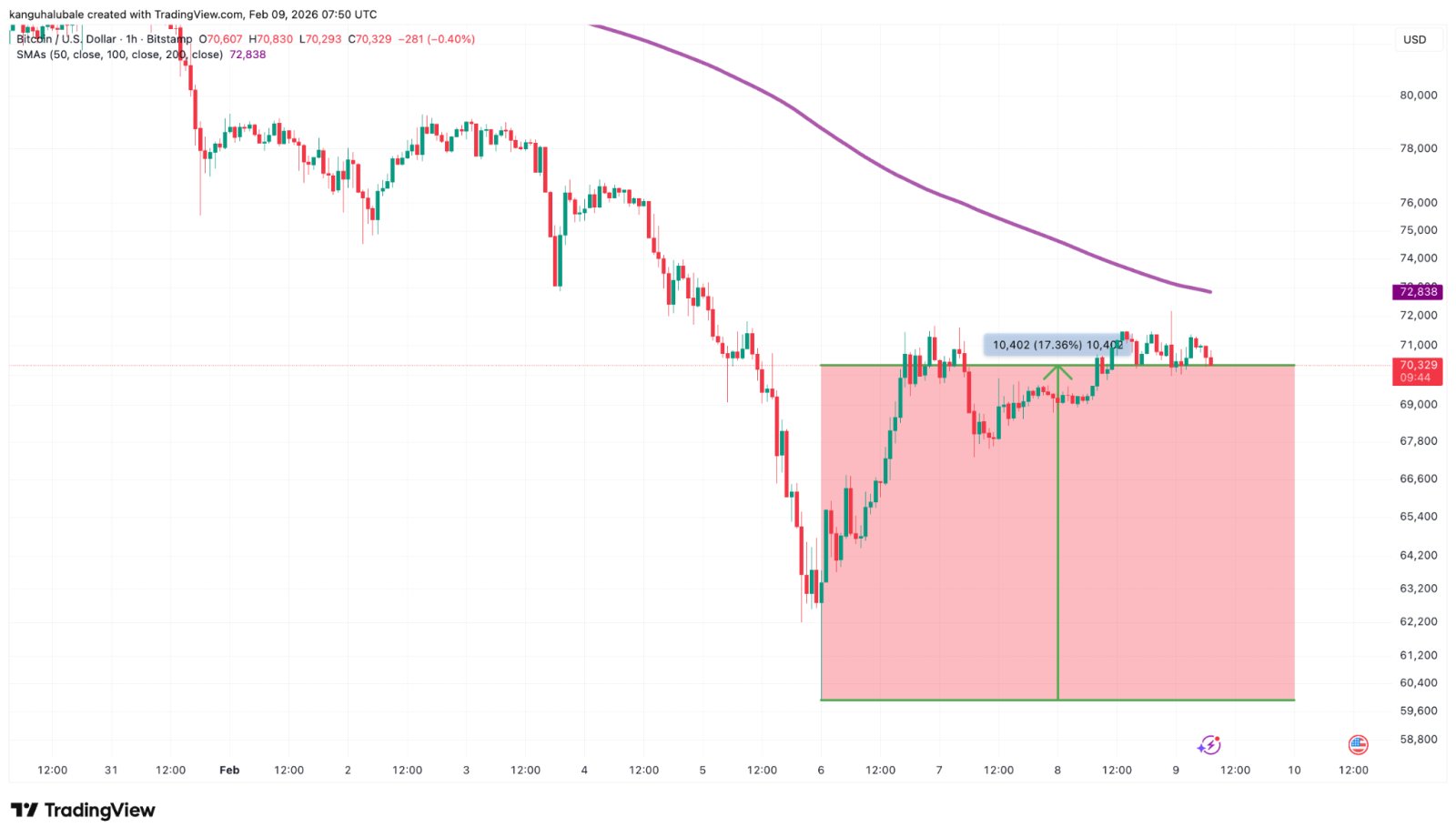 Ein ähnliches Szenario könnte sich kurzfristig abspielen, nachdem der Preis von der Widerstandslinie eines aufsteigenden Dreiecks bei 72.000 US-Dollar abgewiesen wurde.