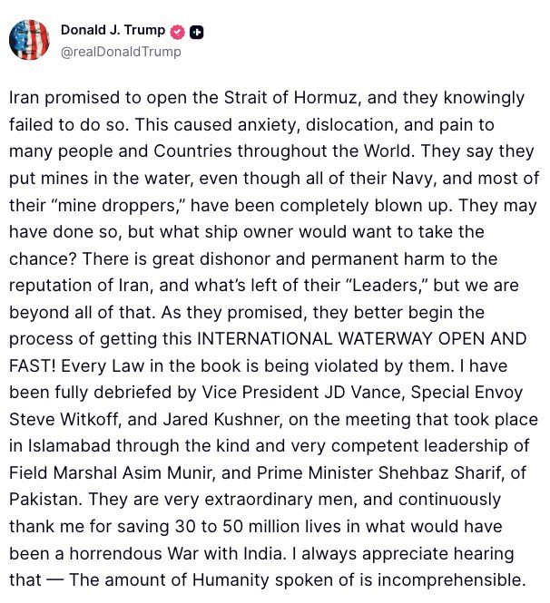„Niemand, der eine illegale Maut zahlt, wird eine sichere Durchfahrt auf hoher See haben“, schrieb er in einem Beitrag auf Wahrheit sozial.