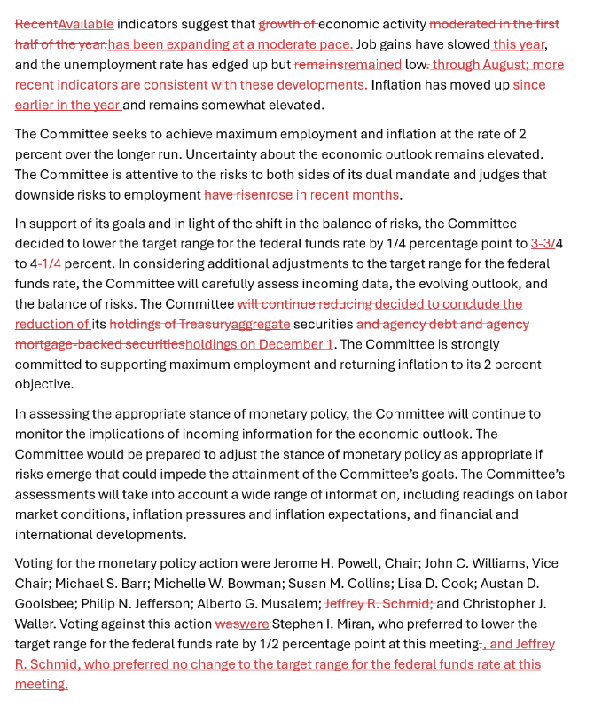 Eine bemerkenswerte Ergänzung der FOMC-Erklärung war die Bestätigung, dass die Fed am 1. Dezember mit der Verkleinerung ihrer Bilanz aufhören wird, was ein Ende der quantitativen Straffung bedeutet.
